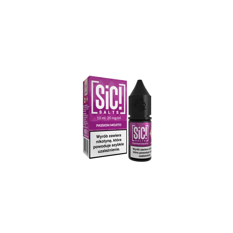 Liquid SIC! Salt 10ml – MOJITO Passion Mojito 20mg/ml to e-liquid na bazie soli nikotynowej, przeznaczony do użytku w e-papierosach. Jego smak inspirowany jest klasycznym koktajlem mojito, łącząc nuty świeżej mięty, limonki oraz egzotycznej marakui, tworząc orzeźwiającą i cytrusową kompozycję.